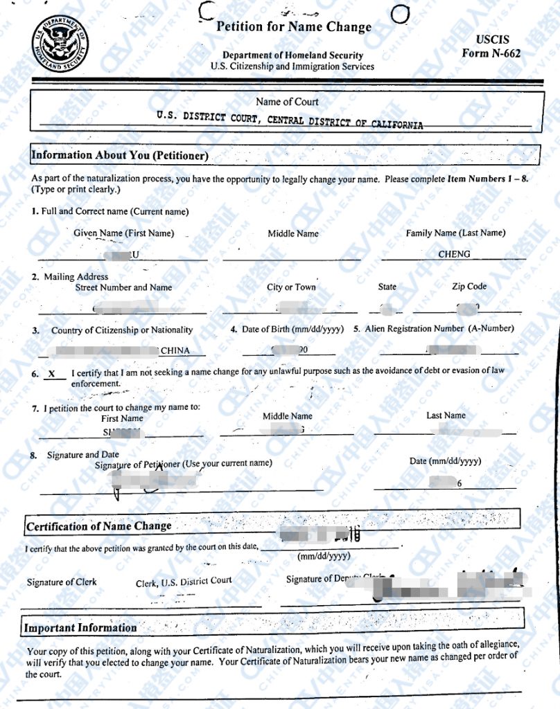 入美国籍后证明自己和原来的中国身份是同一人。Petition for Name Change,改名证明,入籍后证明中国名字是自己,美籍华人如果曾经更改过名字,在国内涉及到房产买卖、财产过户、在公安局申请中国永久居留或放弃美国国籍时政府部门会要求申请人提供更名。