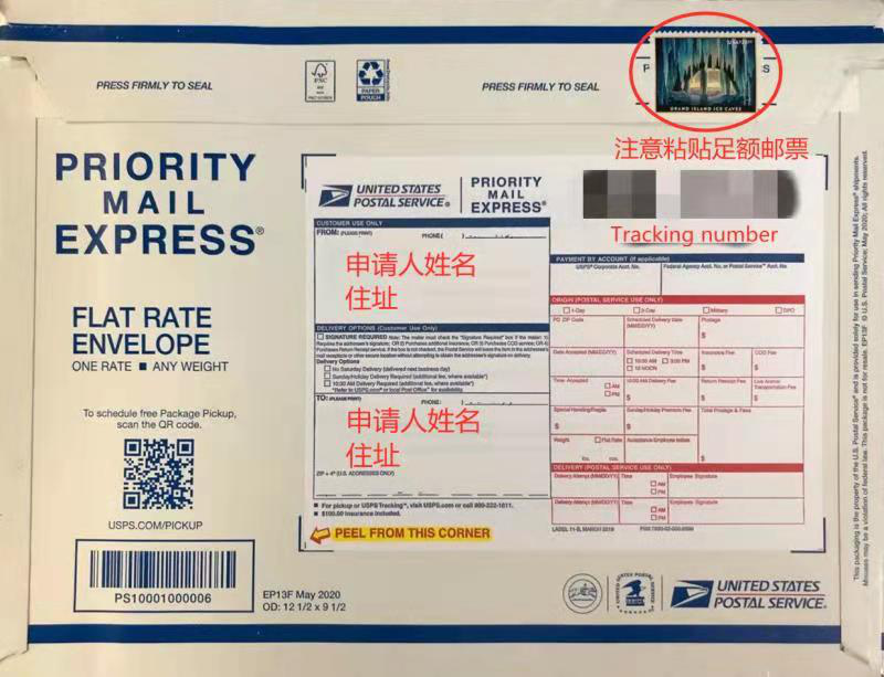 (3)回邮信封的要求:已贴好邮票或已付费的USPS的EXPRESS MAIL或PRIORITY MAIL(需有邮寄查询号Tracking Number), 不接受其他快递公司邮件,请将邮票、LABEL纸贴好在回邮信封上,写好地址(寄出地址和邮寄地址均填写申请人的姓名和美国境内地址),自行将Customer Copy取下,以便日后查询。邮寄过程中可能出现证件丢失、损毁、延误等情况,相关责任由申请人自行承担,中国驻芝加哥总领馆不承担任何相关责任。