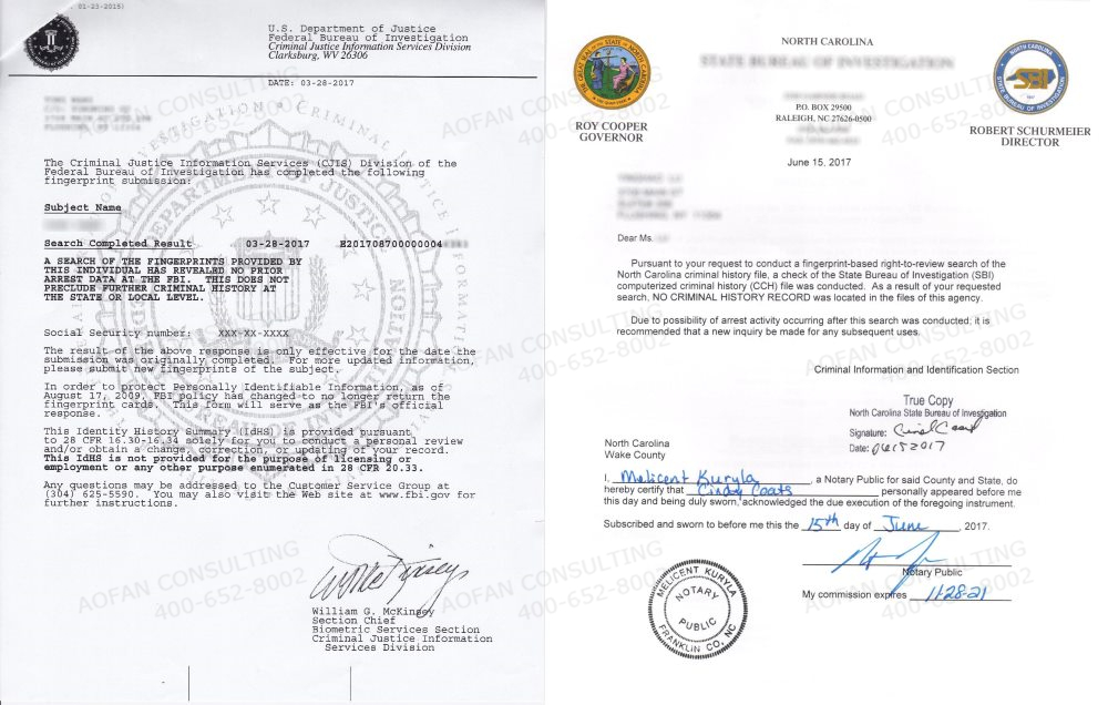ECV提供美国的FBI无犯罪记录申请,包括指模录入,申请,领事馆三级认证的全套服务,不管您在中国还是美国,找我们准没错。